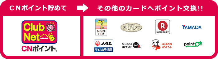 「CNカード」で貯めたCNポイント(R)は、ドコモポイントやnanacoポイント、楽天スーパーポイント、JALのマイル、Suicaポイント、ヤマダポイント、WAONポイント、ポイントオンのポンと交換できます。