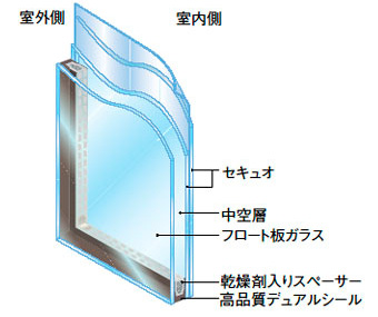 複層ガラスの片側または両側に合わせガラスを使用したもの。断熱性能に優れているとともに、合わせガラスの中間膜を厚くしたり、破りにくいポリカーボネート板などを挟んだりすることで防犯性能をより向上させることができます。