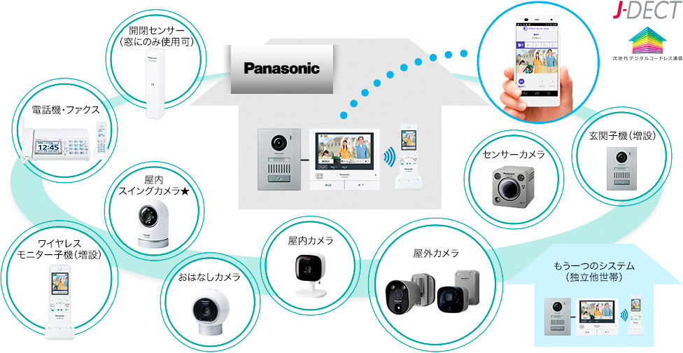 ワイヤレスカメラ、開閉センサー(窓にのみ使用可)、ドアセンサー、ファクス、電話機など様々な機器とモニター親機を接続すれば、おうちの様子をかんたんに確認することができます。