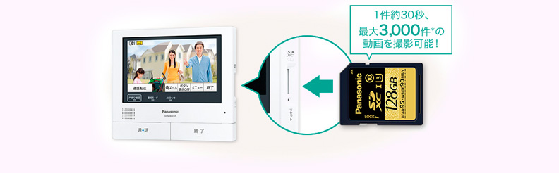 モニター親機は来訪者をSDカードに動画で保存することができます(1件約30秒、最大3,000件*)。